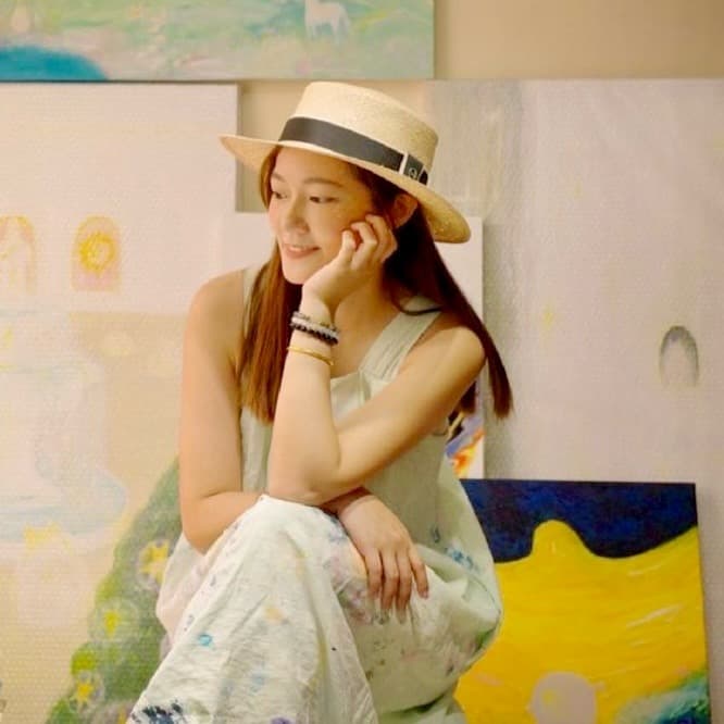 她創造了象徵源頭之光的「白燿毛怪Furry Friend」,並結合大自然元素,巧妙運用噴點法和柔和色彩,建構出一個發光的感知世界,以獨特和諧氛圍及沉浸式創作,連結觀眾內心,希望透過創作,讓人們感受生命的純粹本質,在未知的內在旅程中感到安心與期待。